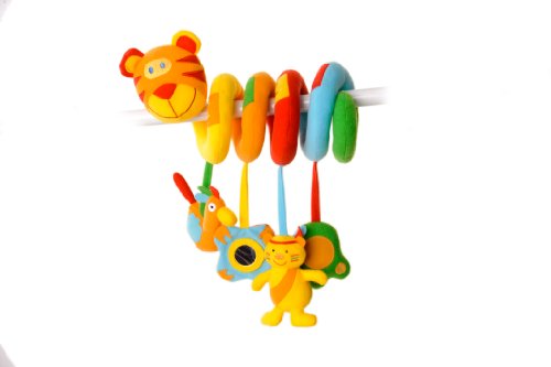 - Bright coloured twisty toy to use on car seat handles, frames of buggies.