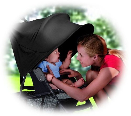 Sun-proof your stroller canopy. Careful: most stroller canopies still leave some tender skin exposed! Don't take chances - strap our bigger, better, sun-blocking canopy right over the top. Easy to attach and adjust, with handy bottle and storage pockets. Rolls into a self-pocket for storage. Fits all single strollers, even umbrellas with small canopies. Black Only. Hand wash. Imported. Award winner: Winner of the Parenting Media And Parenting Hot Product Awards Provides protection for infants in canopies stroller from over 99% of harmful solar UVA and UVB rays Adjust to protect all the way down to tender toes Side pockets for lotions and special pocket to hold bottles and sippy cups upright Folds into its own pocket/stuff sack Single Dimensions: 18"L x 36"W x 1/4"H Folded dimensions: 10"L x 10"W