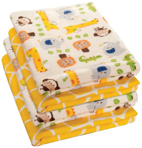 Keep your baby warm and cozy with Kids Line happy tails receiving blankets made of 100% cotton flannel for plush comfort. The set includes a variety of 4 coordinated designs featuring striking giraffe animal patterns and adorable prints including cute monkeys, lions, giraffes, elephants and alligators. Each blanket measures 30" x 40" and is the perfect size to swaddle your little one.